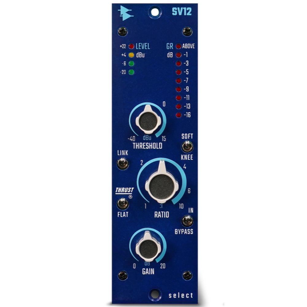 The API Select SV12 features the original compressor circuit designed for the ATI Paragon live analog mixing consoles. Re-engineered for the 500 Series format, the SV12 provides comprehensive, easy to use compression with full LED metering of both output and gain reduction. The unit also includes API’s patented THRUST circuitry which protects sensitive high frequency content of the audio signal even under the most vigorous of compression ratios. Two channels can be linked for use as a stereo compressor with true RMS power summing of the left and right signals.