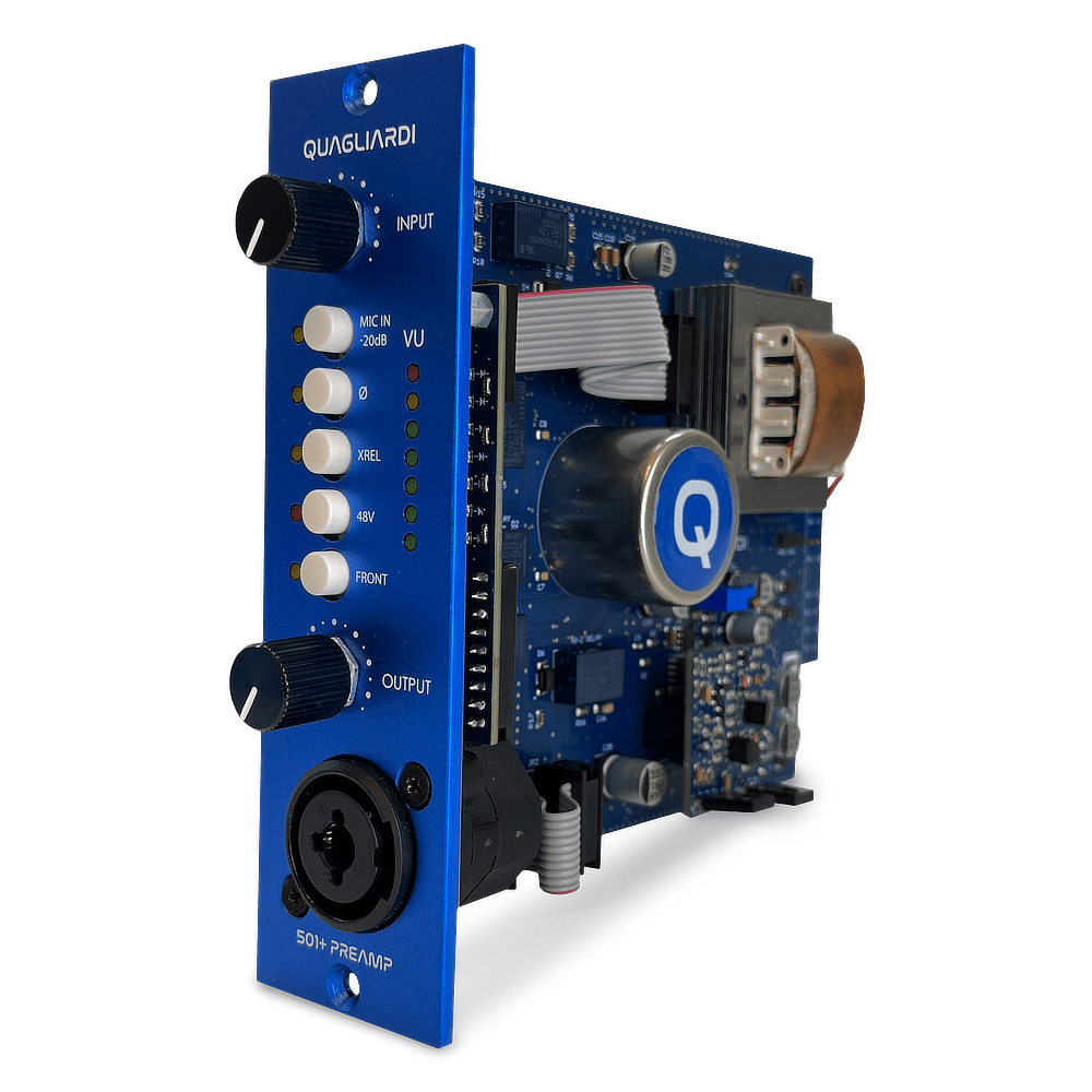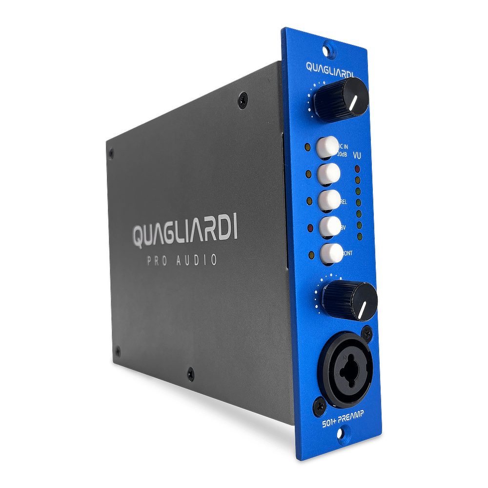 The Quagliardi 501+ is a 500 series preamp module featuring custom transformers, XREL mode for color options, and a front-facing combo jack for XLR and DI input.