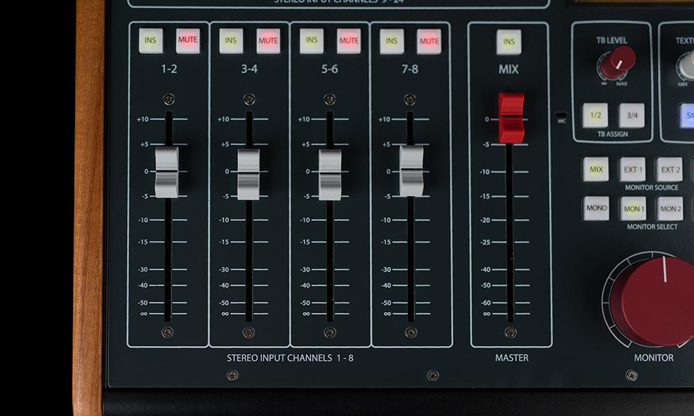A professional grade 100mm fader determines the level of stereo input channels 1-8. Channels 1-8 can be either stereo or center-panned mono, and have both mute switches and inserts. The insert send of channels 1-2, and 3-4 has optional talkback assignment for use when feeding channels 1-8 through the 5060 to multichannel queue systems. The insert sends on channels 1-8 may also be used as a pre-fader send to a multi-track recorder.