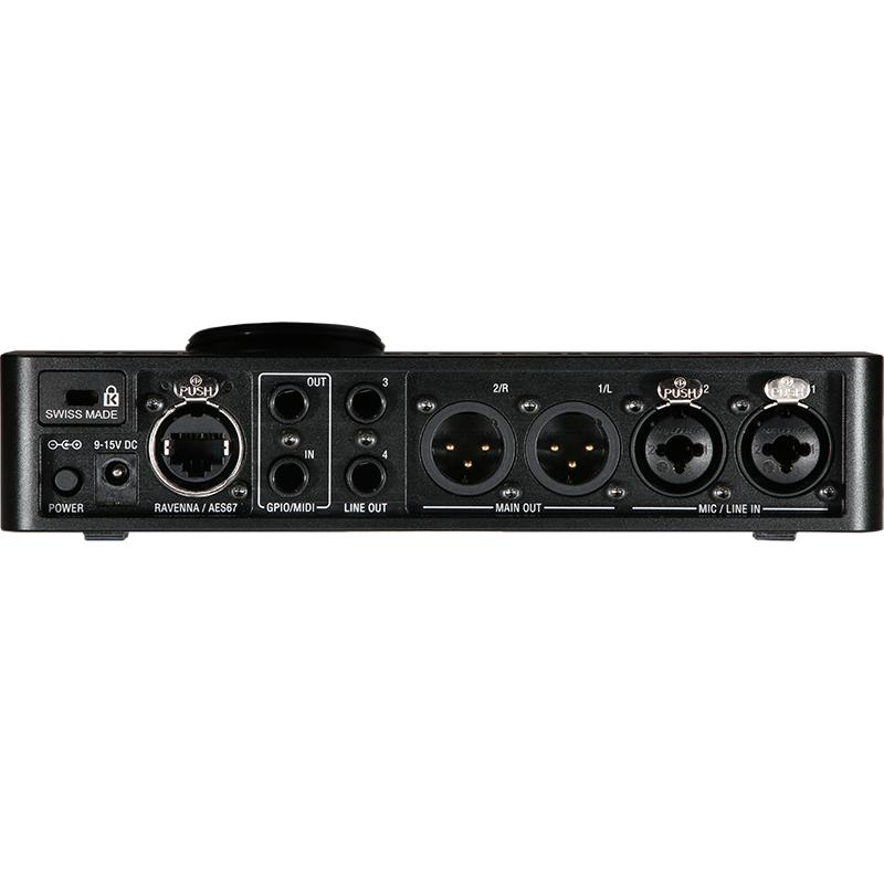 Anubis includes 2 x Mic/Line Inputs, 2 x Instrument/Line Inputs, 4 x Balanced Outputs, 2 x Headphone Outputs, Talkback mic, Ravenna/AES67 I/O.