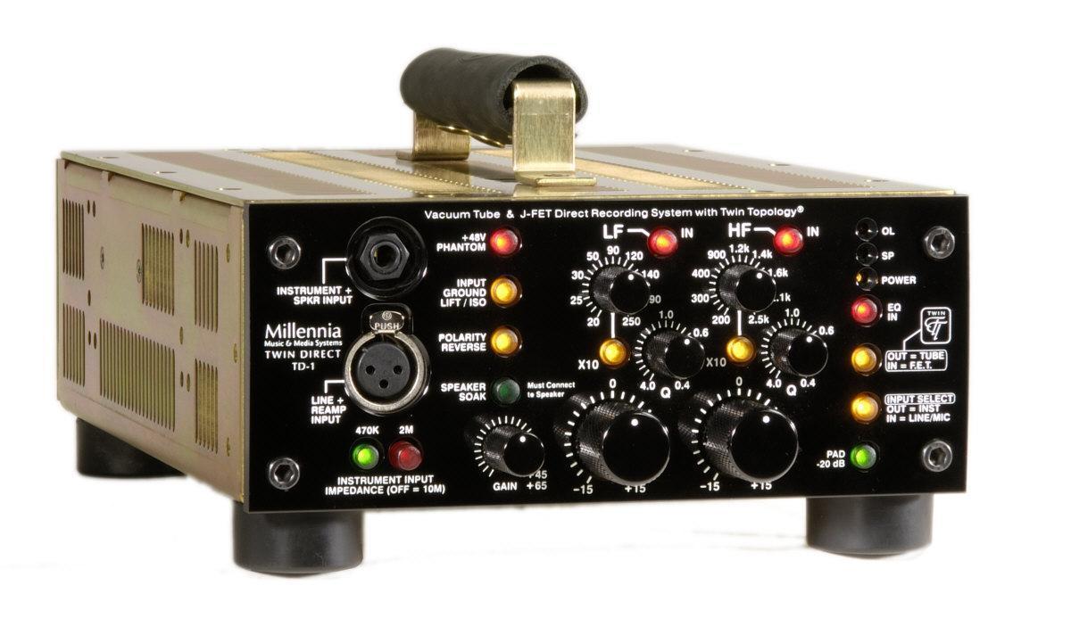 The Millennia TD-1 is a half-rack, single channel Class A recording system offering dual REAMP outputs, selectable impedances, nine outputs, fully parametric EQ, Speaker Soak, HV-3 mic preamp with 65 dB gain, nine outputs, three transformers. Twin Topology DI.