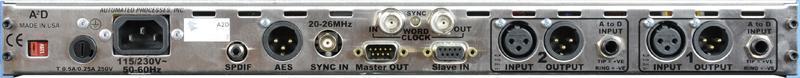 The A2D analog section consists of the circuitry contained in two API 312 mic preamps, or one half of the popular 3124 quad mic preamp rack product. A level control pot with an expanded 20-segment metering system shows precise mic gain levels. Control switches include polarity, 48v phantom power, input pad, 2:1 transformer routing, and Mic/Line select. Each analog input contains a balanced low-level XLR connector and a high-level line input on a 1/4 inch jack.
