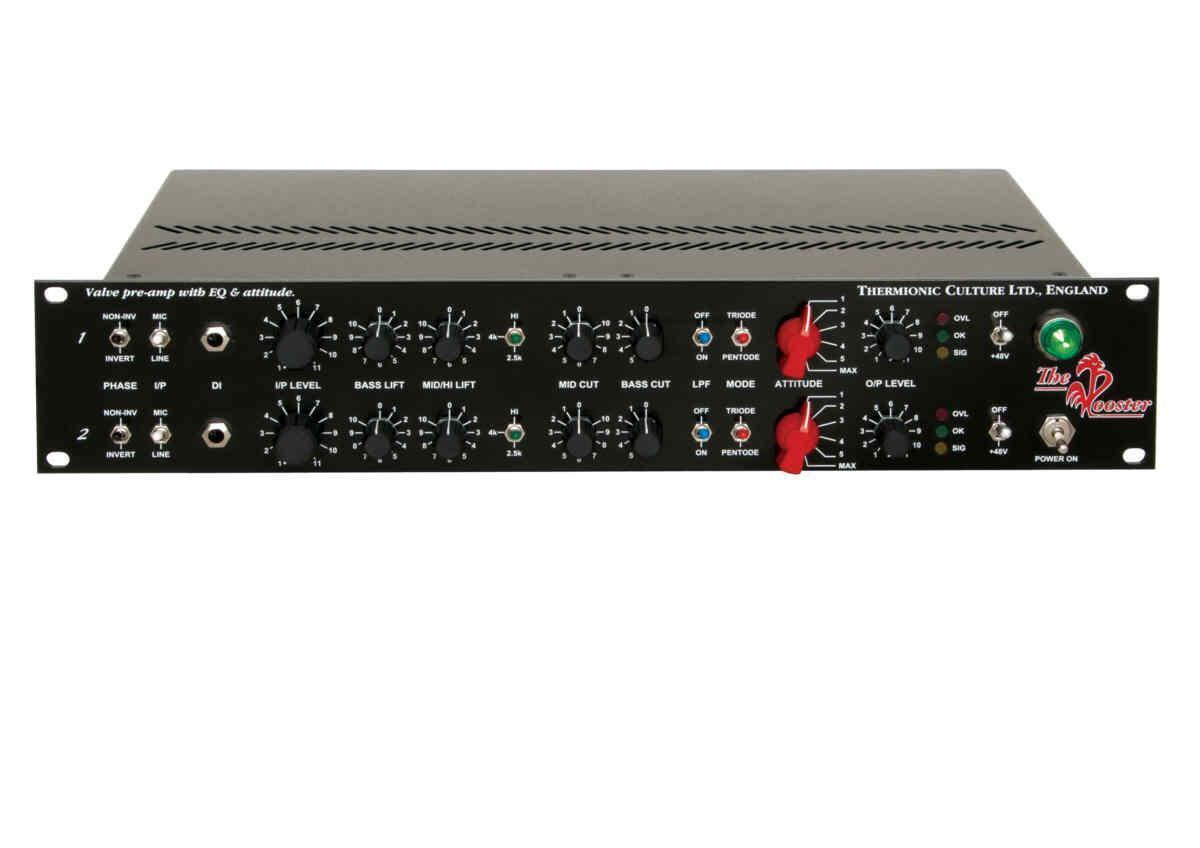 The Thermionic Culture Rooster 2 is a 2 channel all valve preamp with EQ and distortion controls. It is designed for a wide range of applications and can produce a large range of tones, harmonic distortion and subtle dynamic control.