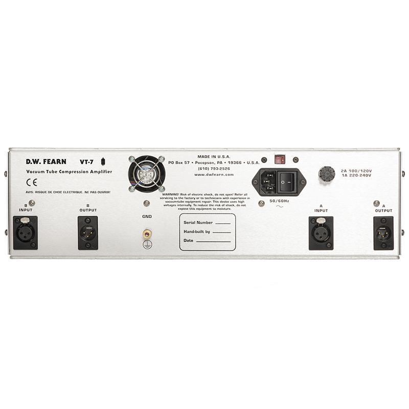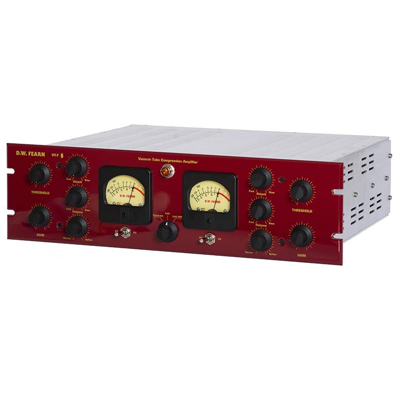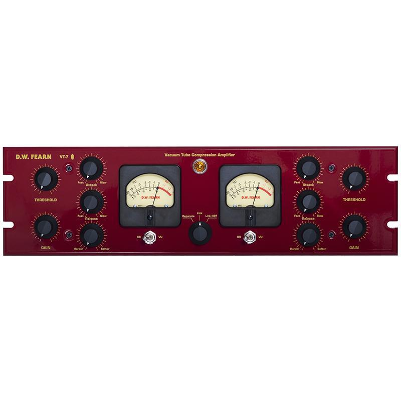 The DW Fearn VT-7 is a stereo Class-A vacuum tube audio path compressor. The gain reduction elements utilize circuitry that duplicates the sound and characteristics of the finest classic vacuum tube compressors; without depending on tubes that are no longer manufactured. The control circuitry is modern solid-state analog.