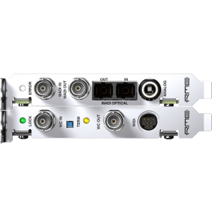 The included expansion board carries word clock I/O (BNC) and MIDI I/O. The word clock input is galvanically isolated via transformer and operates on both single and double speed signals automatically. MIDI I/O offers two completely independent MIDI inputs and outputs via breakout cable (4 DIN sockets). A virtual MIDI port allows for a direct transmission of MIDI data over MADI.
