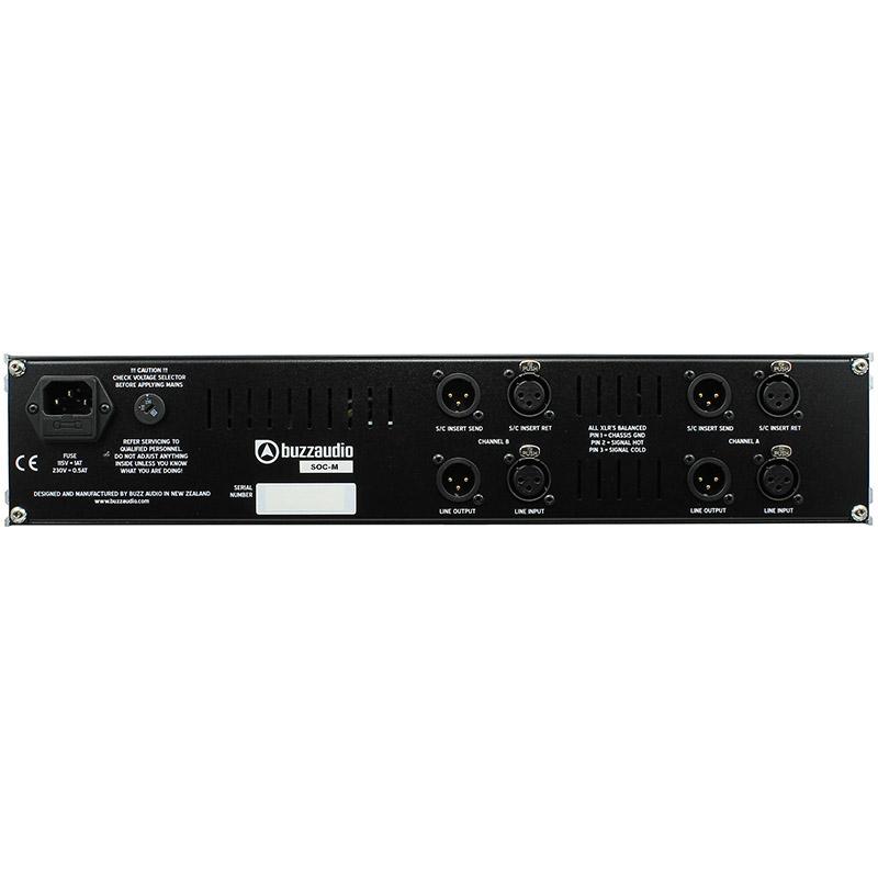 But not only is the Buzz Audio SOC-M a stereo compressor, it also incorporates a Mid-Side (or sum and difference) encoder and decoder which is a very powerful mastering tool. When set to MS mode, signals that are common to left and right are processed by Channel A and the left to right difference signals by Channel B. Check out the SOC-20 audio samples to see how powerful this process can be. In addition, when set to MS mode, the mid and side signals are available as balanced outputs on the rear panel insert send XLR's