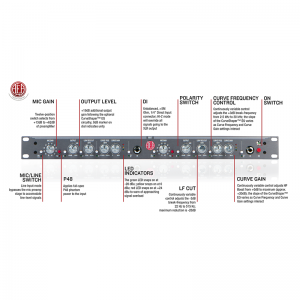 The CurveShaper’s high-frequency filter boost enables you to add a little extra “presence” or “air” to your source. The circuit functions in a similar manner to a conventional parametric shelving boost, but with a significant difference: the slope varies as both the CurveShaper™ and HF Gain controls are adjusted. This unique bell curve was designed with the intention to compensating for the high-frequency roll-off that is inherent to most ribbon microphones. But beyond ribbon mics, the smooth HF filter is remarkably well suited for brightening up condenser microphones used at a distance, restore presence in overly “dry” acoustical environments, or even as a clean and transparent air-band boost on the 2-bus.
