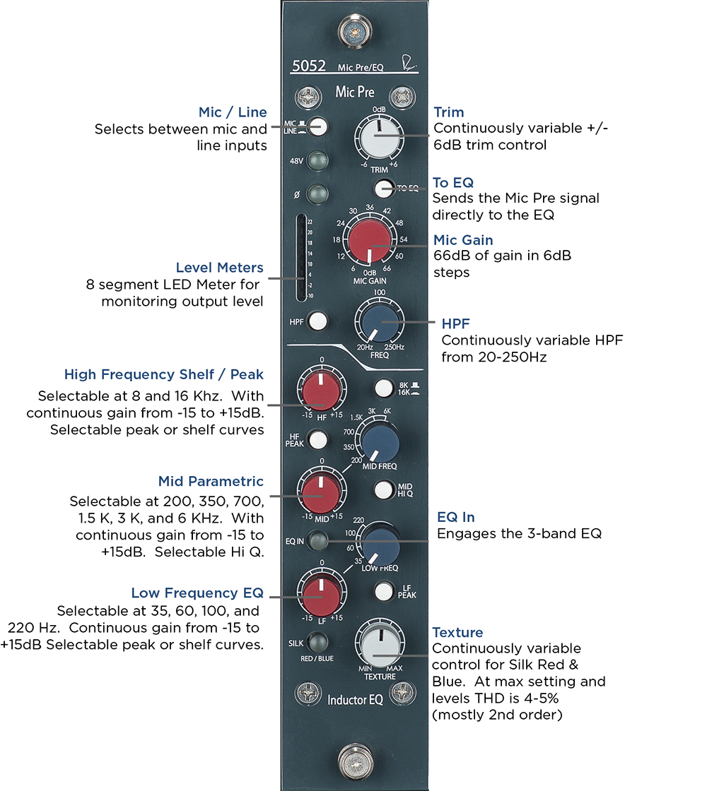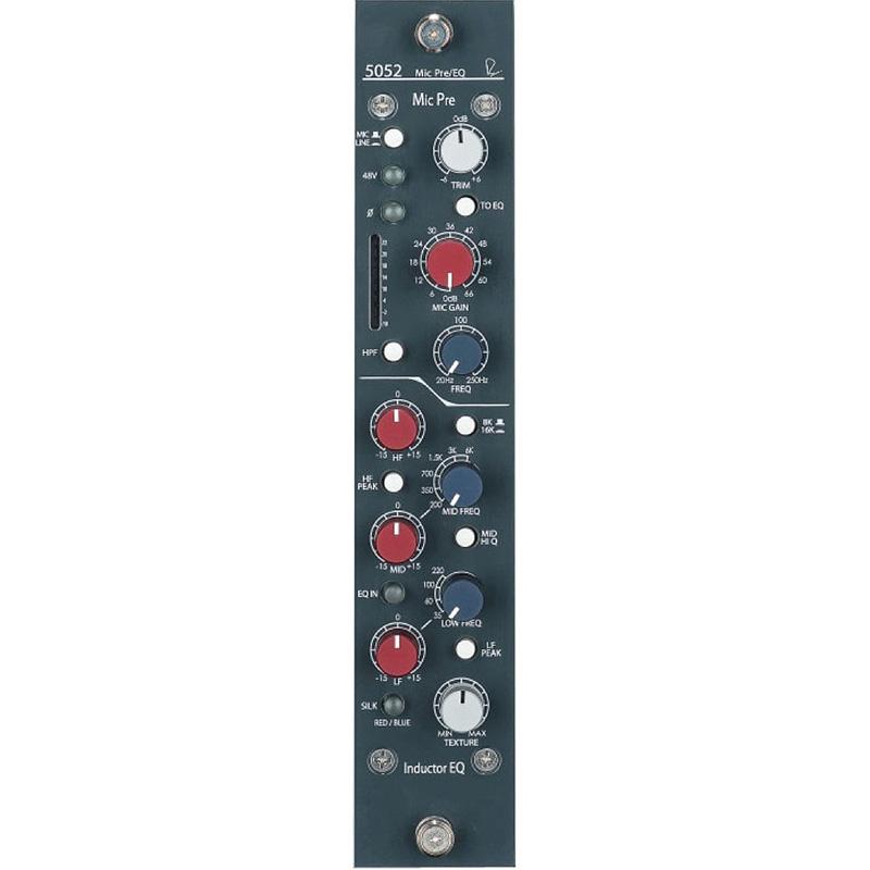 Like Rupert’s designs from his time in Shelford, the 5052 preamplifier has 72dB of discrete, class-A gain coupled with serious square-core transformers. Unlike the classics however, the output transformer features the Silk Red / Blue and Texture controls from the Portico II Series to hone the harmonic content and tonality of the output stage. By engaging these controls and sufficiently driving the output, the 5052 can produce up to 4-5% THD (primarily 2nd order, some 3rd order), bringing a richness and thickness to tracks when desired with no danger of overloading the output stage. With Silk disengaged, the output is modern and pristine, yet still retains Rupert’s signature larger-than-life transformer sound. The mic pre section also includes a sweepable 20-250Hz high-pass filter, Mic / Line selection, 48V phantom power, and polarity reverse.