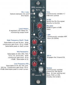 Following the preamplifier, the 5052 has a transformer-coupled output, which allows the 5052 to feed a tape machine or DAW directly from the mic pre while still using the EQ and Silk / Texture in a dedicated analogue mix path such as that found with a 5088, 5060 or vintage console. This output can also be used to insert a separate compressor between the mic pre and the EQ, or it can allow the 5052 to work with two separate sources. When the “TO EQ” button is engaged, the mic pre signal is routed directly into the EQ such that the mic / line input signal flows through to the main output as a single channel strip.
