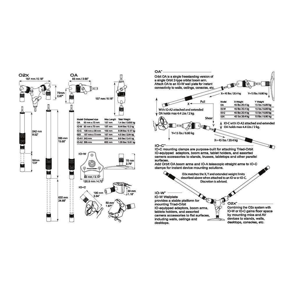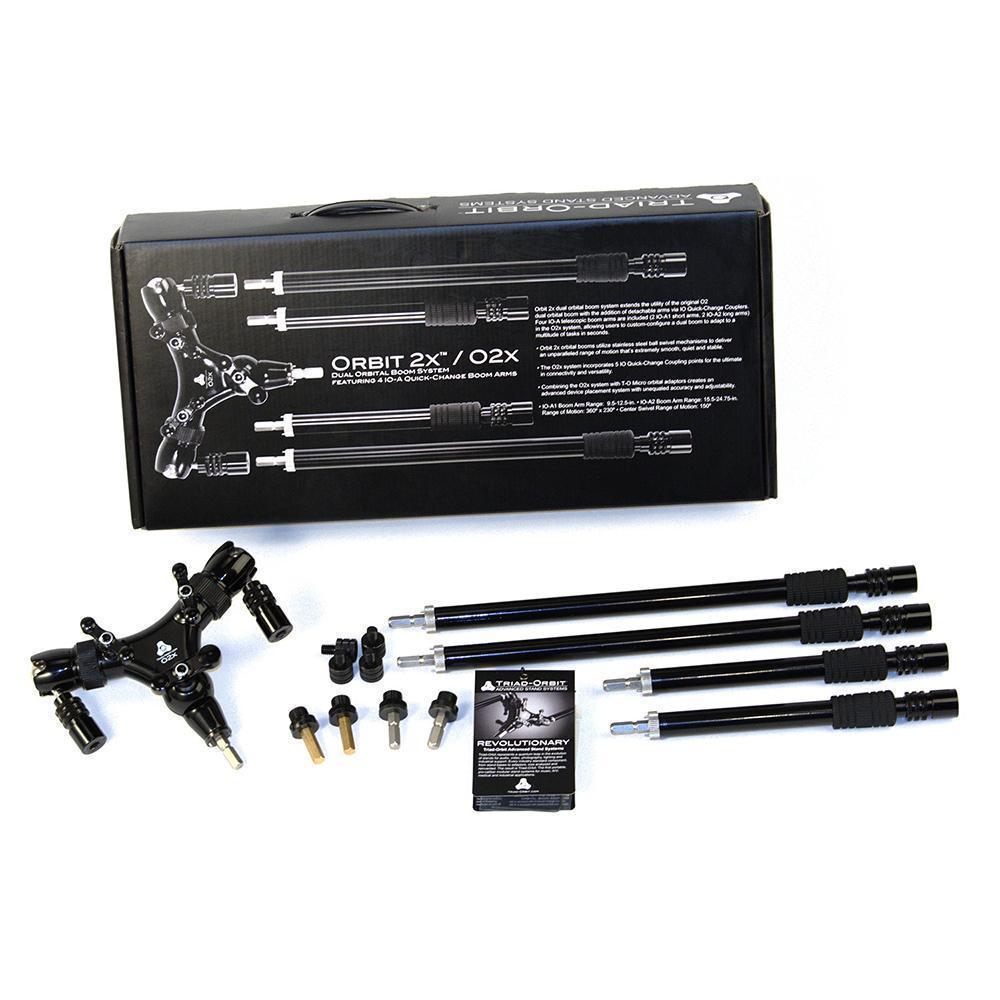 Orbit dual orbital booms feature a unique dual-arm design – each arm equipped with the proprietary ORBIT ball swivel mechanism – making it one of the most versatile booms on the market. Orbit Series O2X dual orbital boom system extends the utility of the original O2 dual orbital boom with the addition of detachable arms via IO Quick‑Change Couplers. Four IO‑A telescopic boom arms are included (2 short arms, 2 long arms), allowing users to custom-configure a dual boom to adapt to a multitude of tasks in seconds. Applications across multiple disciplines are now a reality; today it is the ‘go-to’ stand for stereo or dual miking assignments such as grand pianos, snare drum (top & bottom), guitar and vocals, choirs, big bands, and orchestras – Tomorrow it is the center of a full A/V multimedia or Social Media solution holding lights, cameras, microphones. Orbit O2X booms do the work of two stands, freeing up resources when multiple devices are called for and space is limited.Dual boom arms are only part of the ORBIT O2 story. Anchoring ORBIT 2 is a novel center swivel that provides an additional 45° of left-right motion to the boom arms. The Compass Point ball swivel housing provides each O2 boom arm with precise, stable positioning whenever the arms are engaged. And IO Quick-Couplers terminate the end of every O2 arm, offering twice the versatility of conventional booms in a fraction of the time it takes for normal setups.