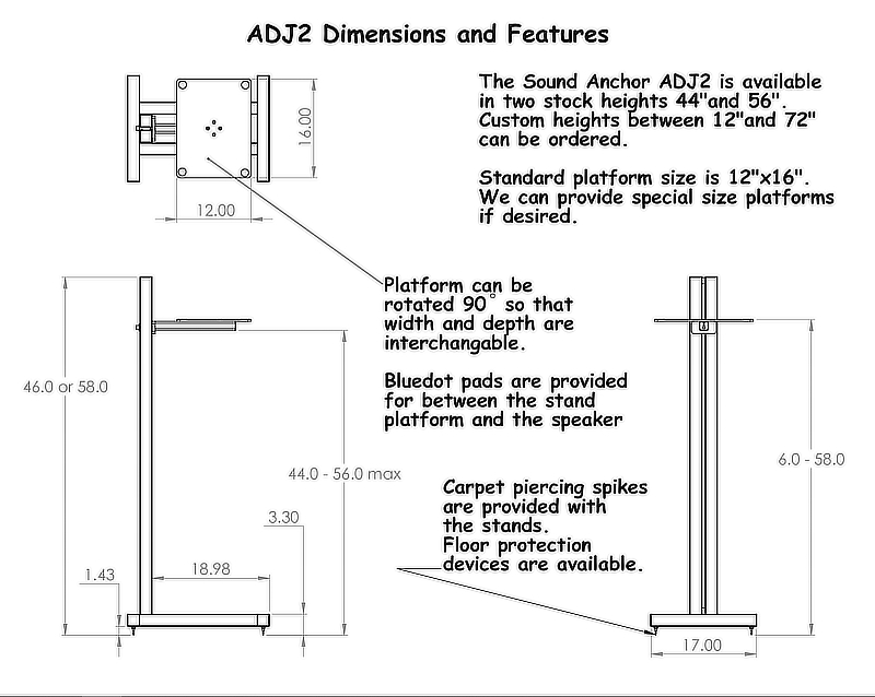 The Sound Anchors Studio Monitor Stands ADJ2 stands are adjustable and designed to allow the engineer to correctly place a pair of monitors behind the console for the best sound. These stands allow height and tilt adjustment of the monitors. Sound Anchor ADJ2 stands isolate the speakers from the console, each other and the floor which gives you a cleaner, more detailed and more accurate sound.